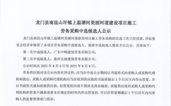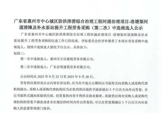 惠州市增江龍門段治理工程施工(一標段)勞務采購比選公告……